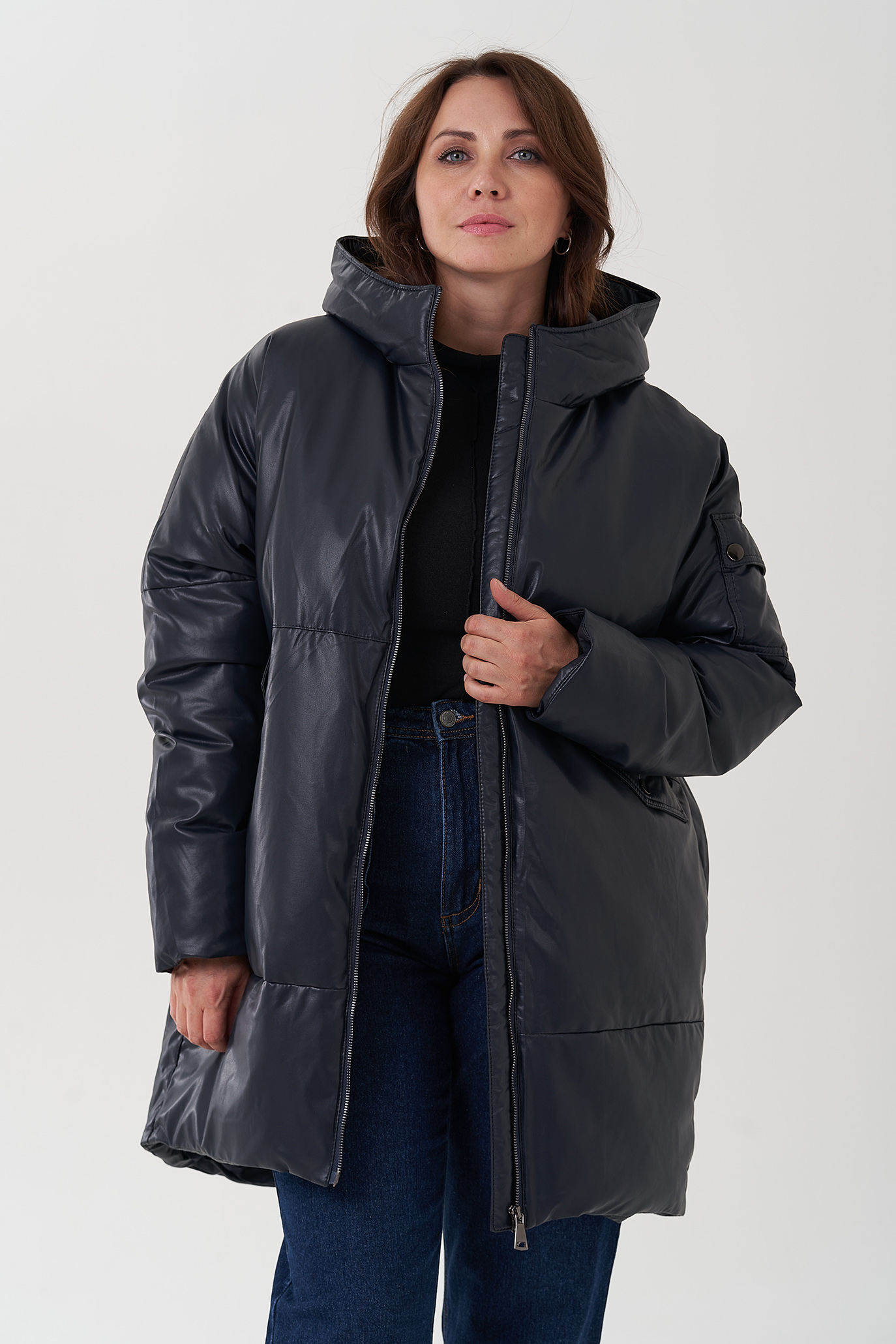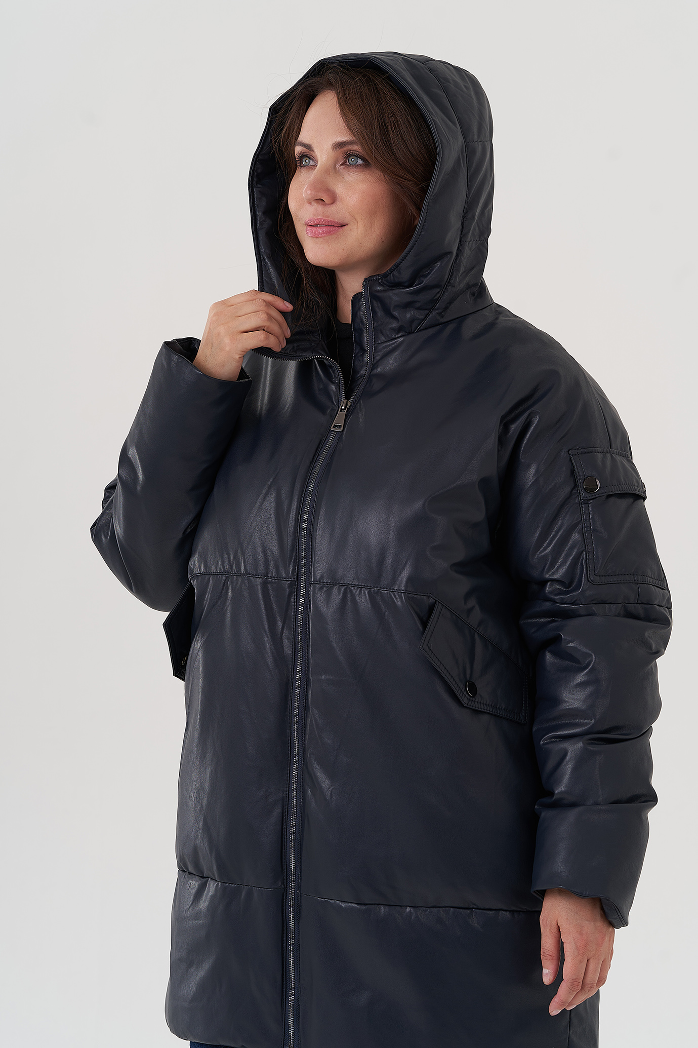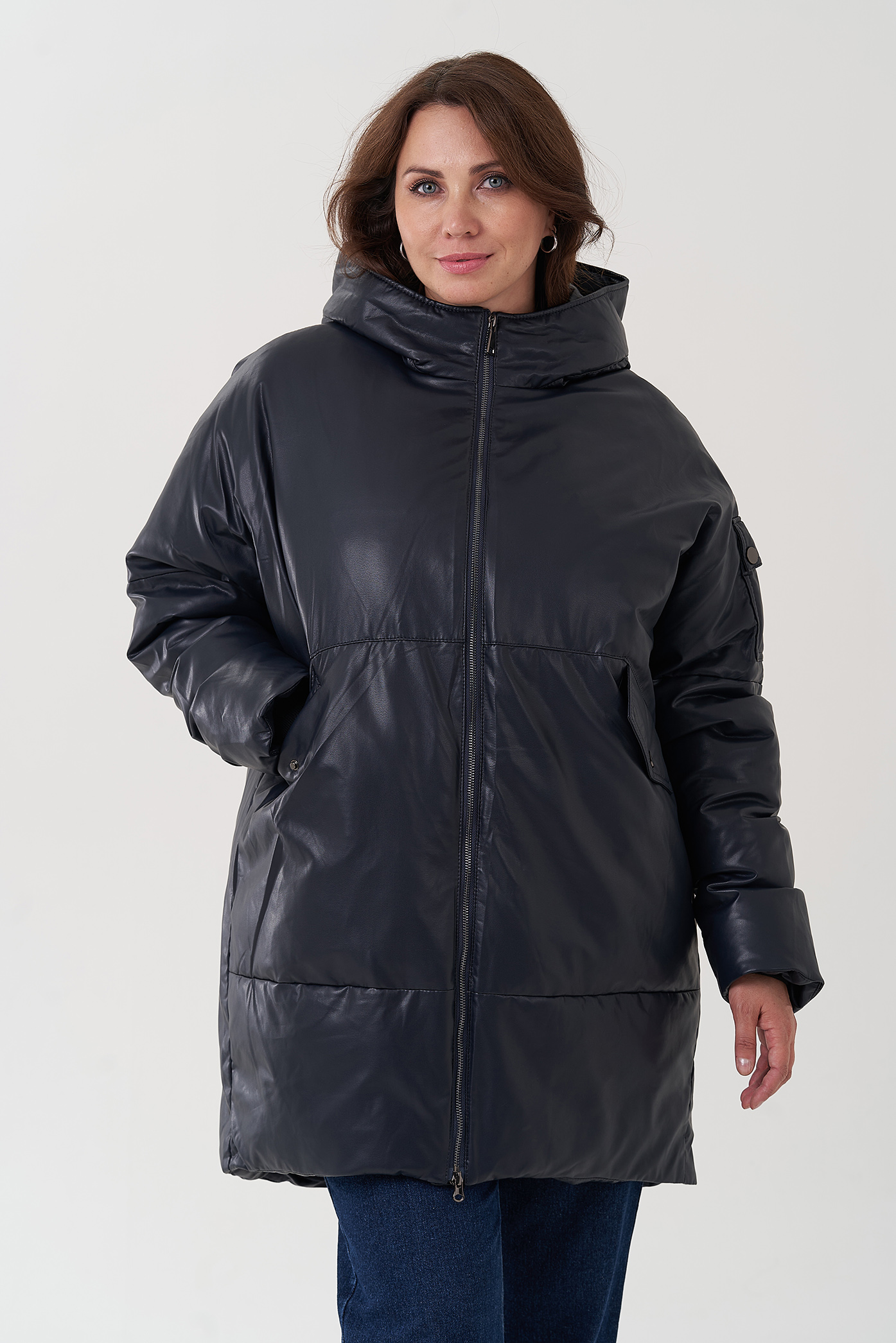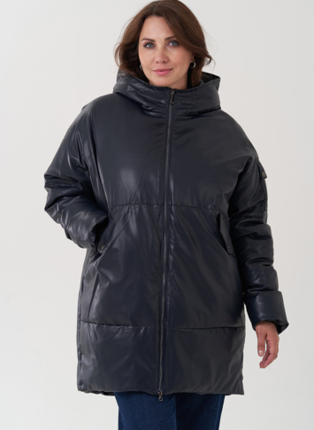 Женский пуховик синего цвета из эко кожи (синий)