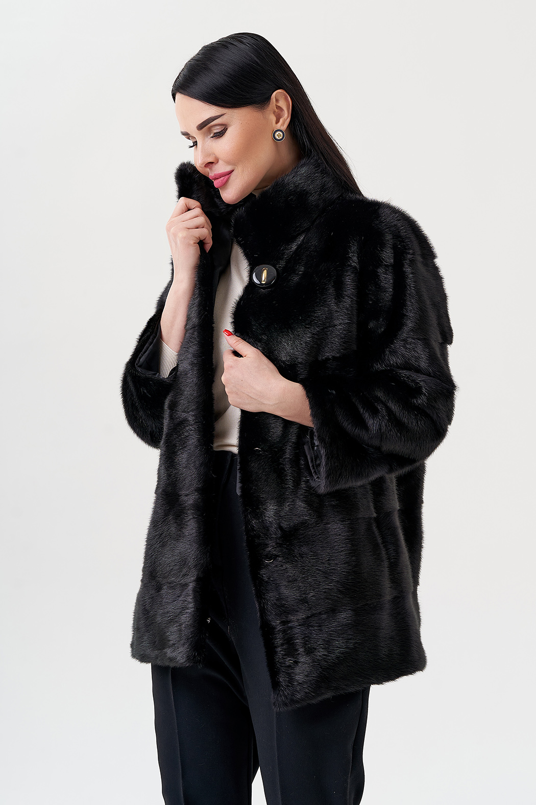 Шуба-трансформер из меха норки. Черный цвет меха практичный и универсальный, подойдет к любой одежде. Длина изделия 95-100 см, но с помощью потайных молний низ изделия можно укоротить. Застегивается на крючки и пуговицу. Воротник стойка защитит от ветра. Пластины меха в поперечном раскладе. Подклад из полиэстера, что делает изделие прочным и термостойким.